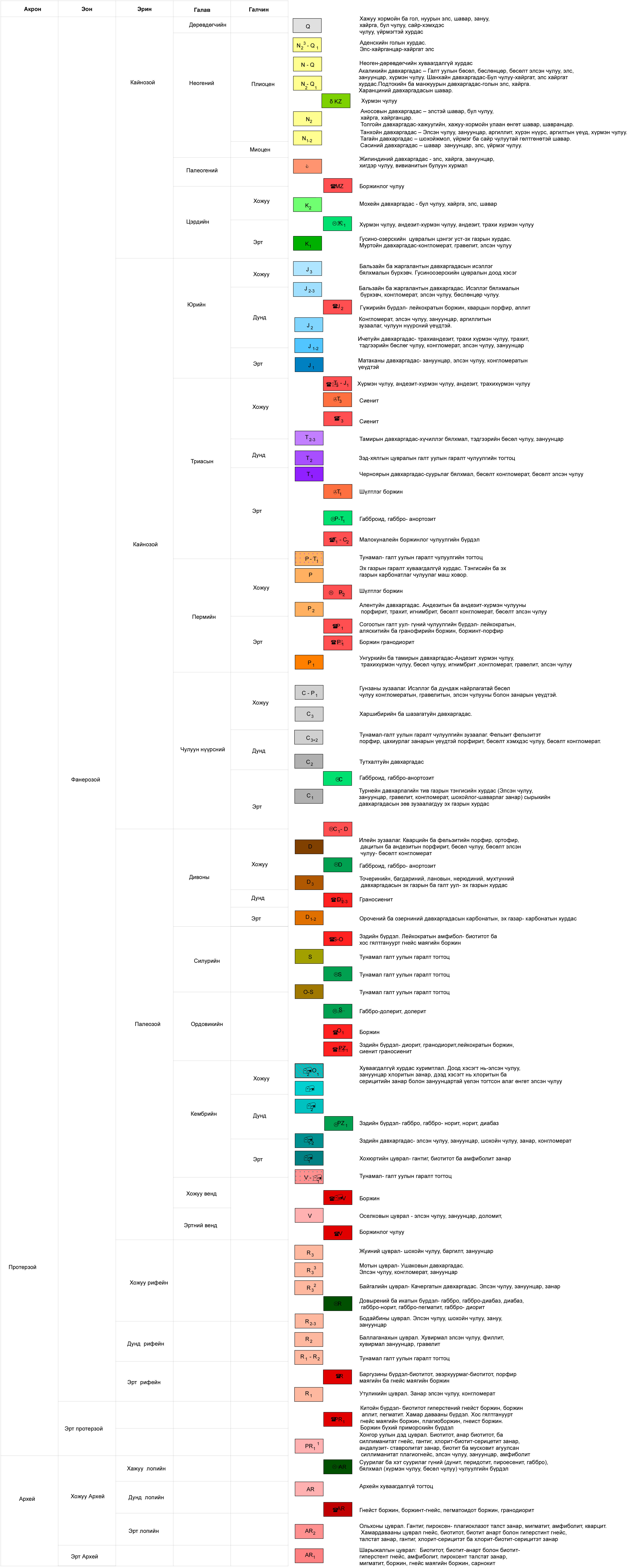 1. Архейн эртний уул үүслийн-мигматит ба гнейс боржин, боржингийн мэшил маягийн биетүүд үүссэн. Архейн хожуу уул үүслийн-ягаан, улаан өнгийн лейкократын шургамал биетүүд, калийн боржин ба аляскит үүссэн.