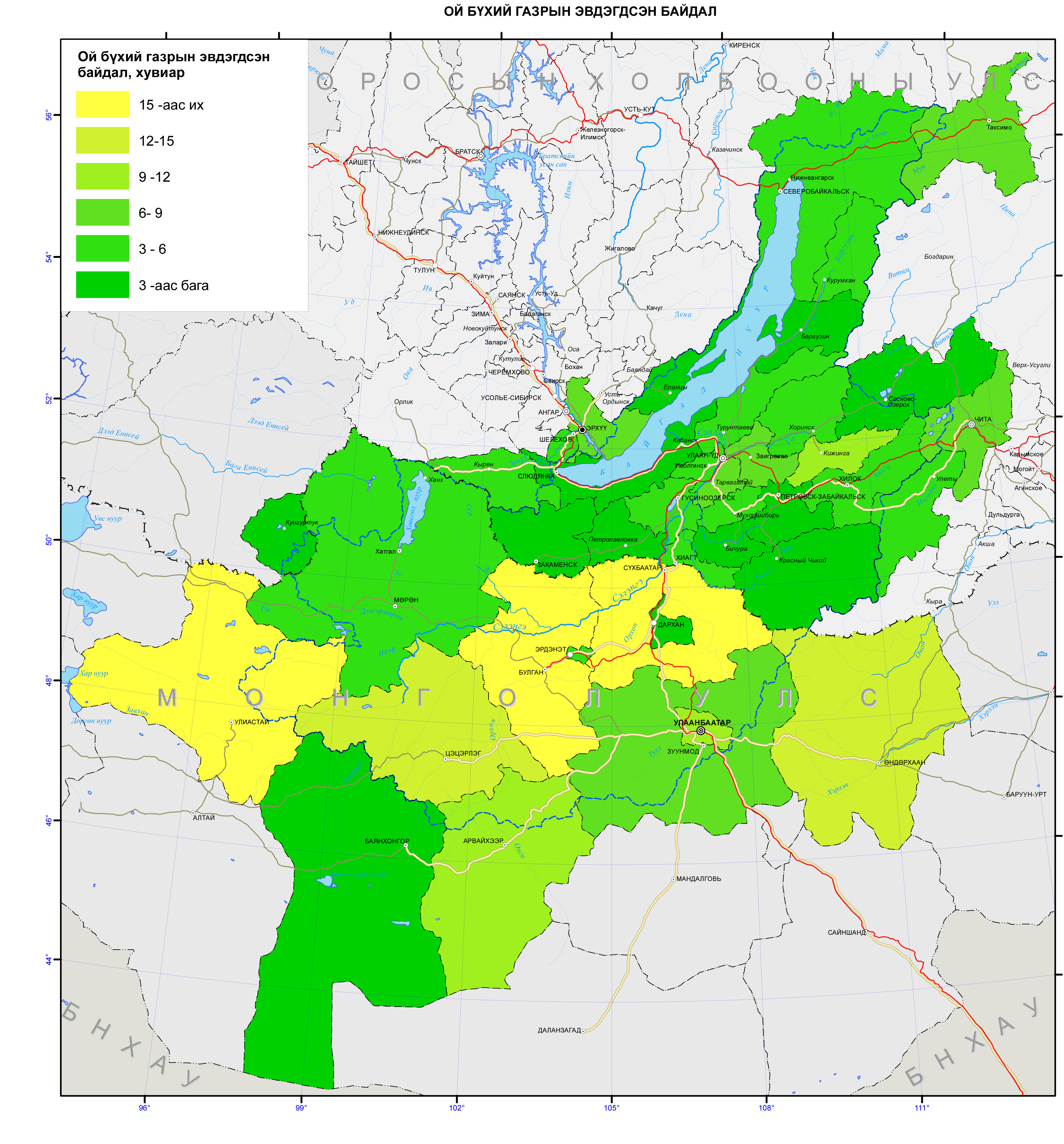 Байгал нуурын сав газрын Оросын нутаг дэвсгэрт ойт газарт гардаг дундаж зөрчил – 6,1% ба Забайкальск мужийн Красночикойск дүүрэгт 0,06%-аас Буриадын Бүгд Найрамдах улсын Кижигинск дүүрэгт 9% хүртэл хэлбэлзэж байна.